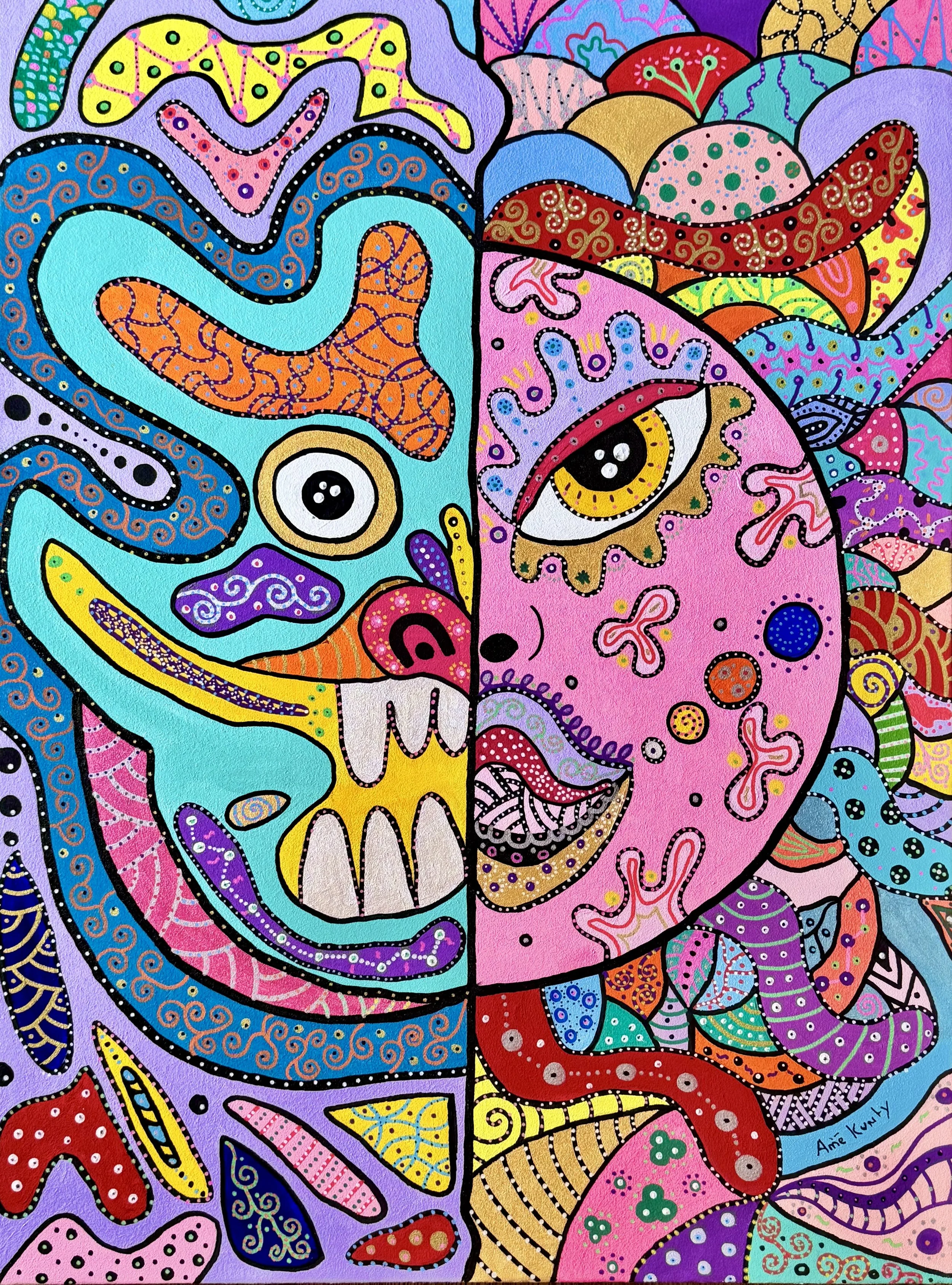 Surrealist and visionary artist, Amé Kunty (France) cultivates a vibrant universe where the aesthetics of the 1990s meet street art, pop art, and naïve art. A nomad at heart, she draws inspiration from her travels and encounters. Her canvases capture raw emotion and inner transformation, like gateways to a more open and luminous reality. Through her work, she celebrates freedom and joy, which she seeks to inspire. For more info, please visit her website, and Instagram.